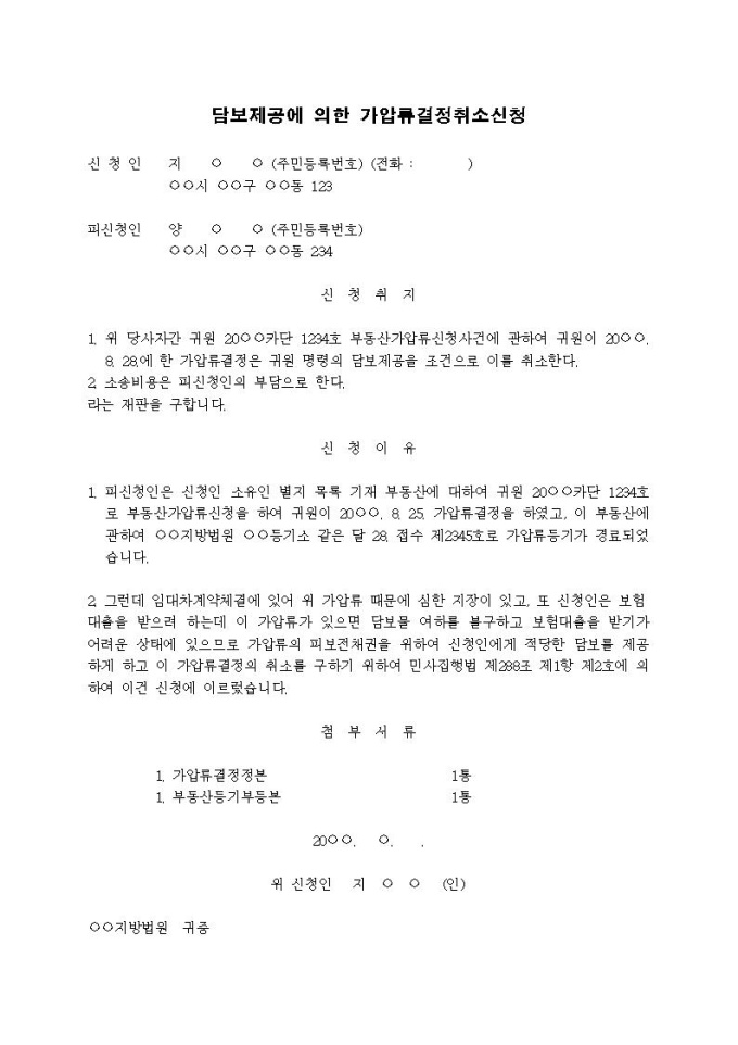 담보제공에 의한 가압류결정취소신청서입니다.