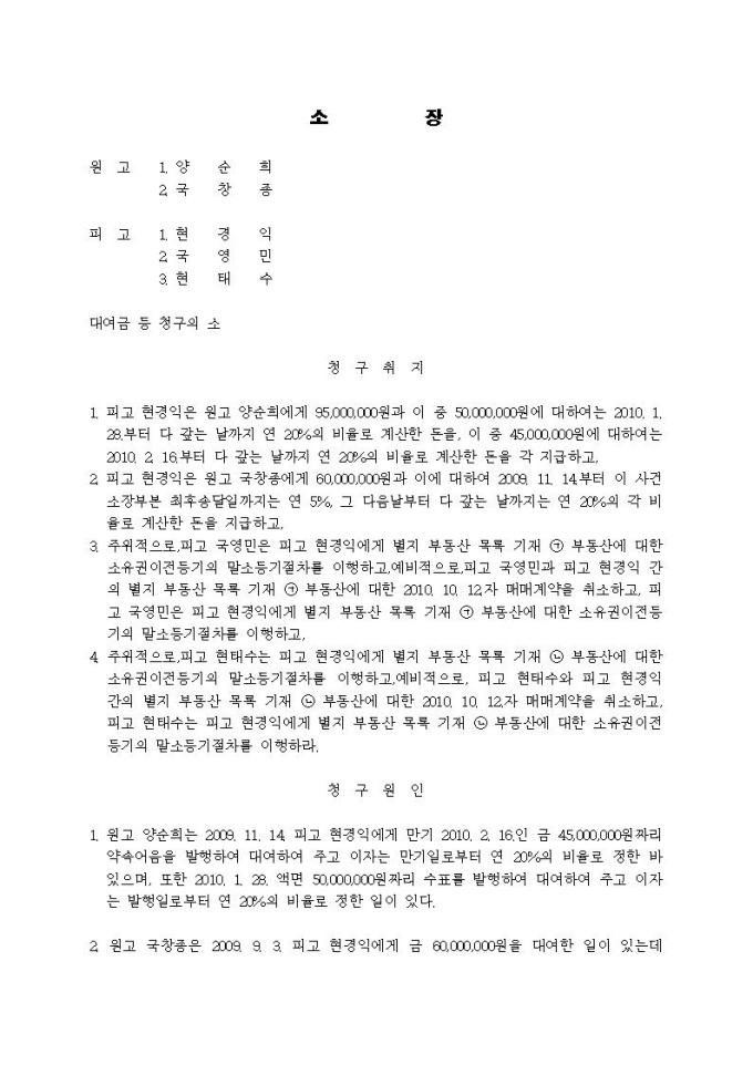 대여금등청구 소장(소비대차, 어음대여, 통정허위표시, 사해행위, 예비적 청구 사건)입니다.