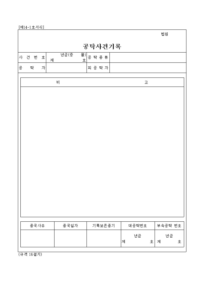 9,000원/월제14-1호서식 공탁에 관한 사건을 기록하는 양식입니다. 공탁종류와 공탁자에 관한 내용, 기타 내용등을 입력합니다.