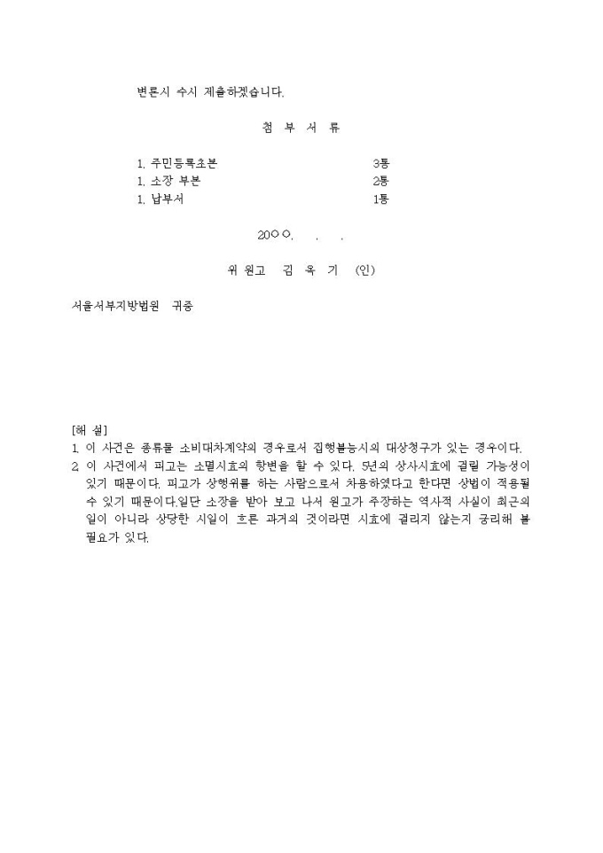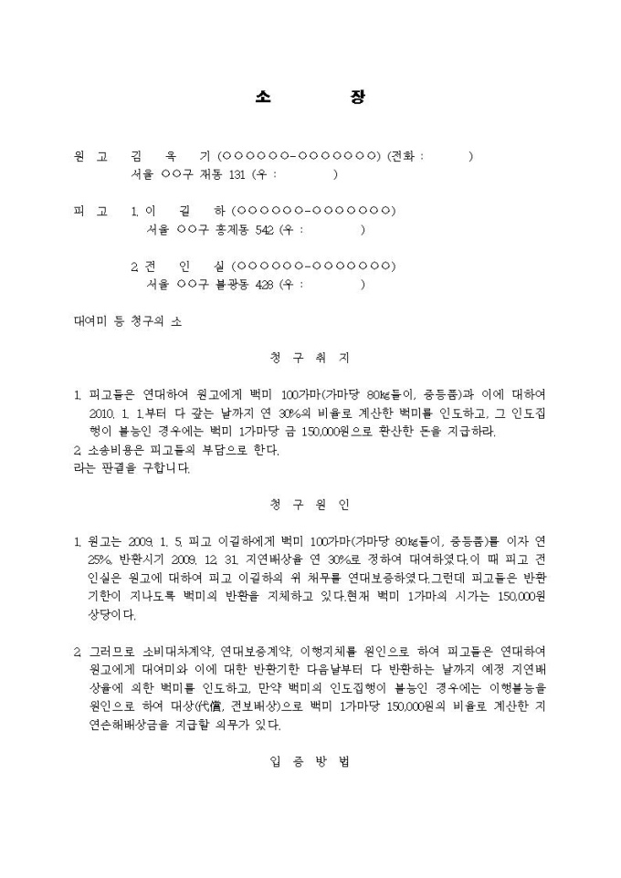 9,000원/월대여미등청구 소장(종류물채권, 집행불능시의 대상청구)입니다.
