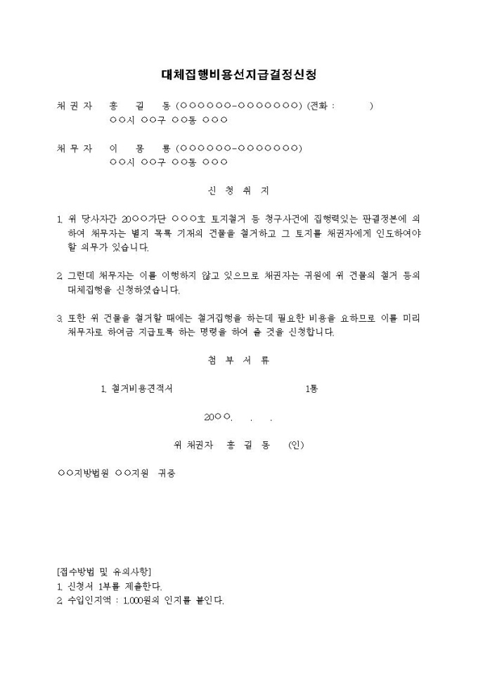 대체집행비용선지급결정신청서입니다.