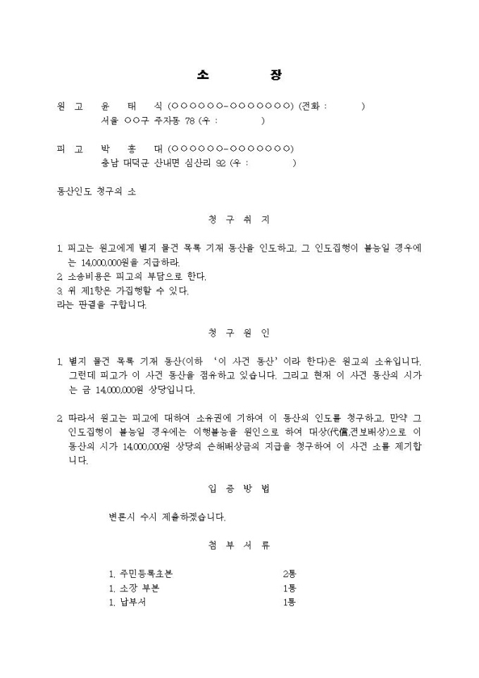 9,000원/월동산인도청구 소장(소유권에 기한 물권적 청구, 대상 청구)입니다.