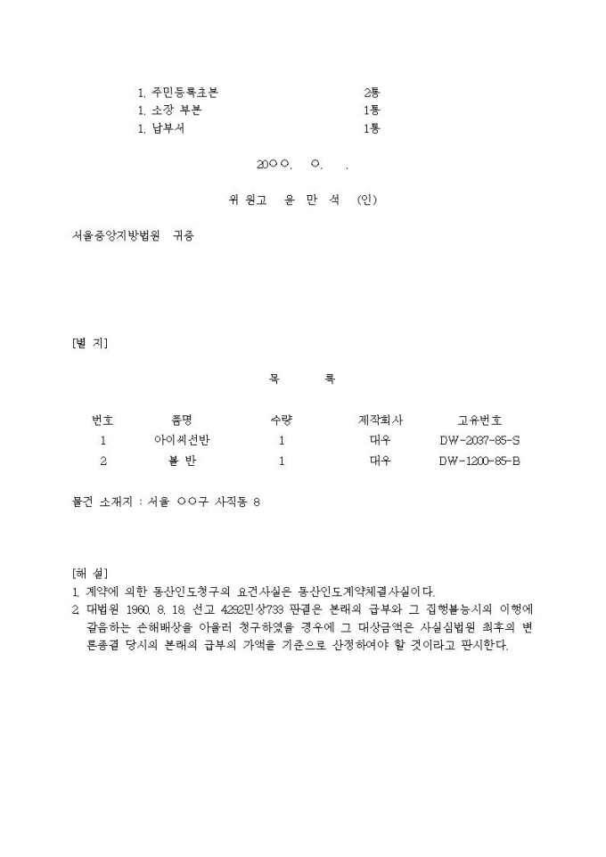 동산인도청구 소장(약정에 의한 동산인도, 대상청구사건)