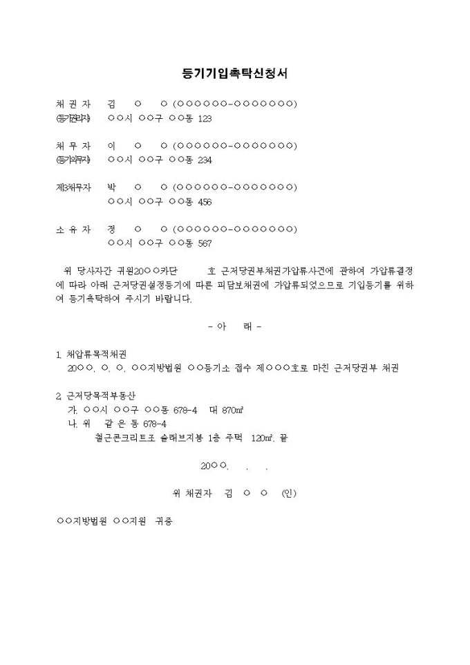 등기기입촉탁신청서(근저당권부 채권가압류)