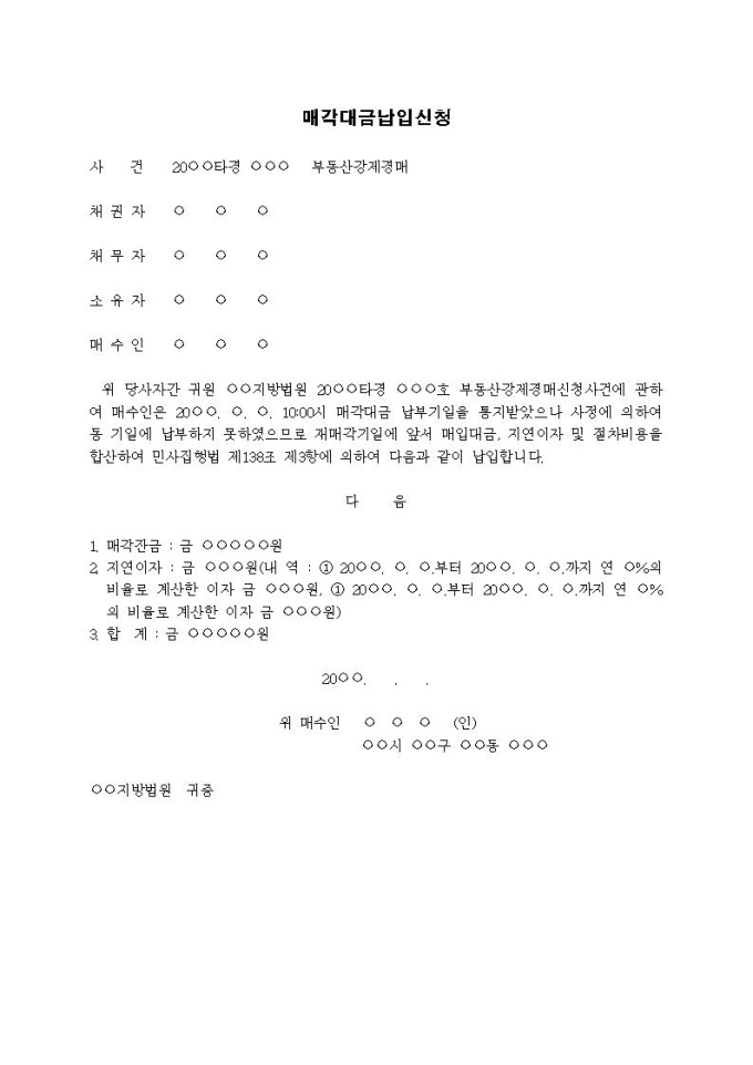 9,000원/월매각대금납입신청서(잔금 및 지연이자)입니다.