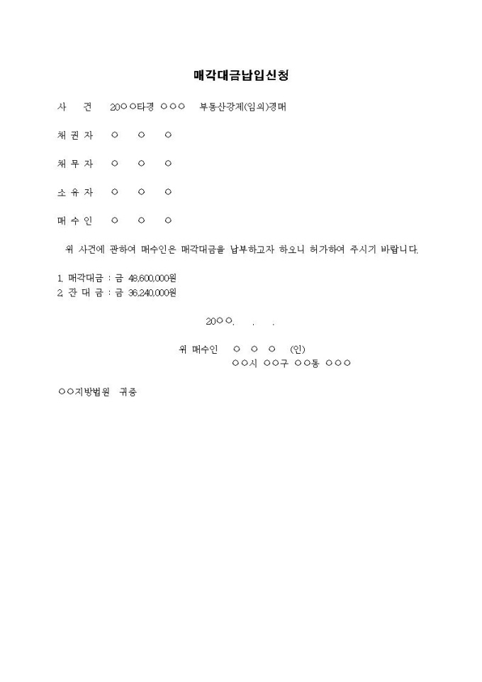 9,000원/월매각대금납입신청서(잔대금)입니다.
