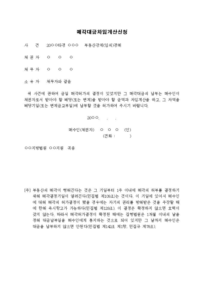 매각대금차임계산신청서(매수인이 배당액과의 차액을 납부)