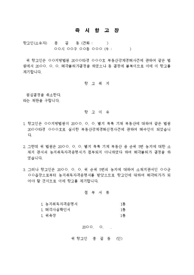매각불허가결정에 대한 즉시항고장(농지미첨부)
