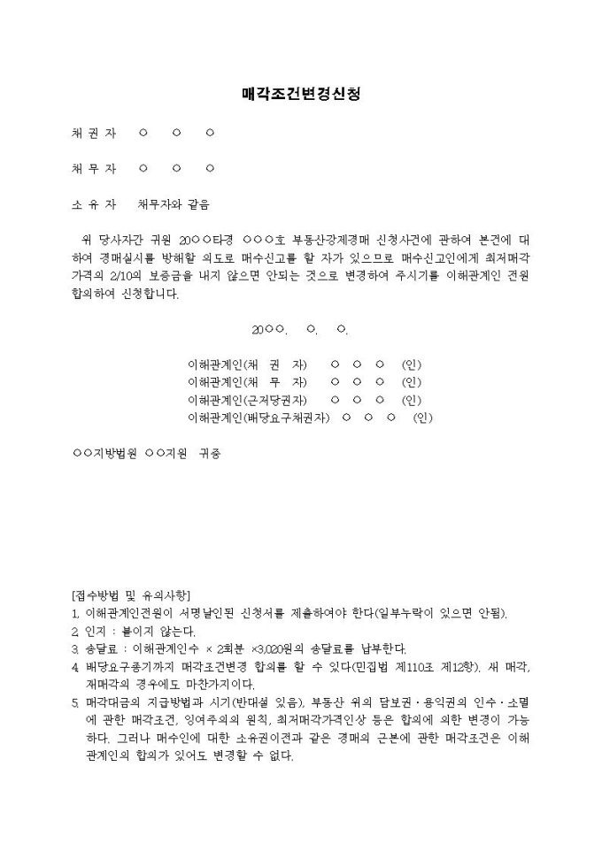 매각조건변경신청서(경매실시를 방해하는 매수자)입니다.
