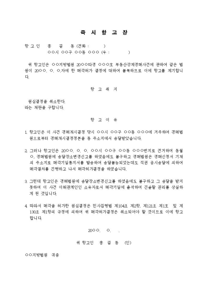9,000원/월매각허가결정에 대한 즉시항고장(송달장소변경신고)입니다.