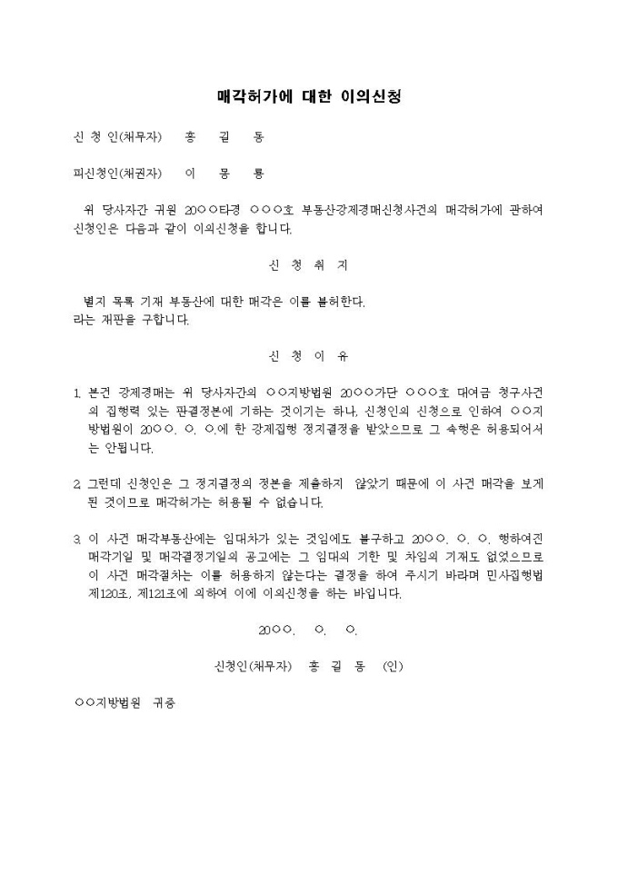 매각허가에 대한 이의신청서(임대의 기간등 미공고)입니다.