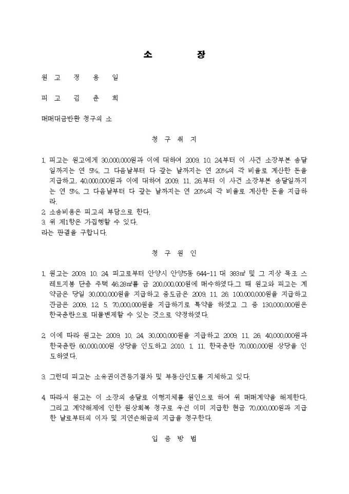 매매대금반환청구 소장(원상회복청구, 이행지체, 특별송달 사건)