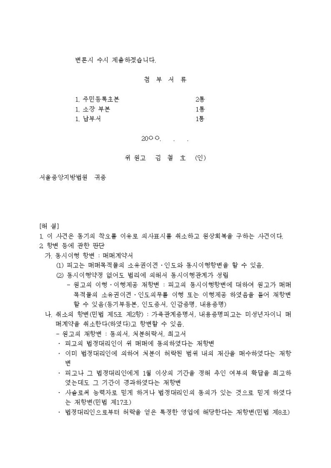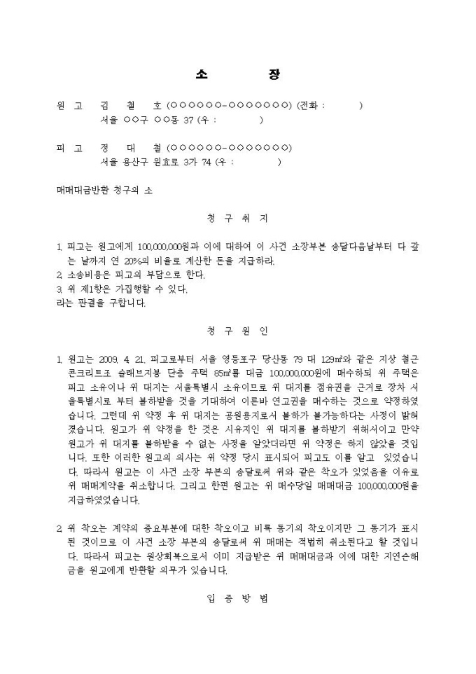 9,000원/월매매대금반환청구 소장(착오를 이유로 한 취소, 동기의 착오, 원상회복의무)입니다.