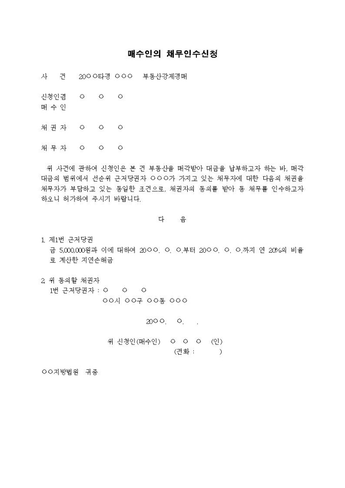 매수인의 채무인수신청서(근저당권채무)