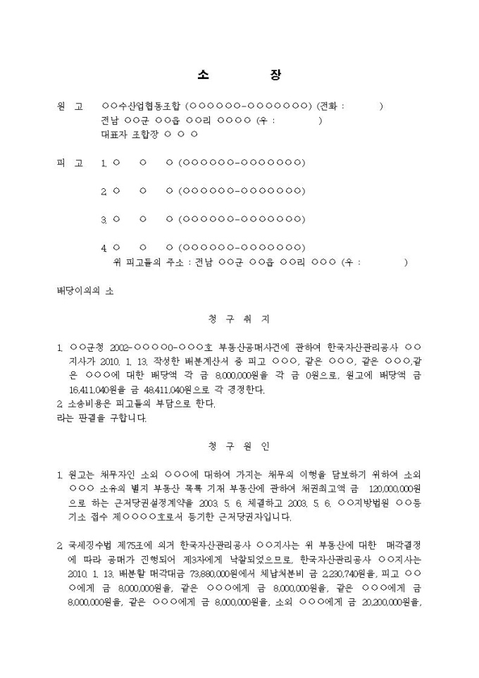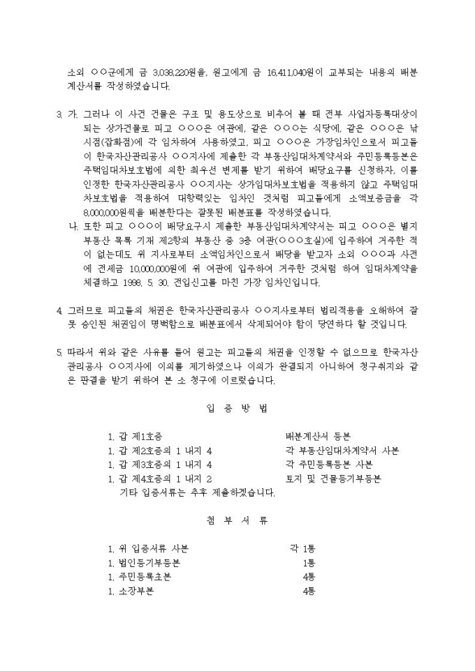배당이의 소장(공매사건, 가장임차인)입니다.