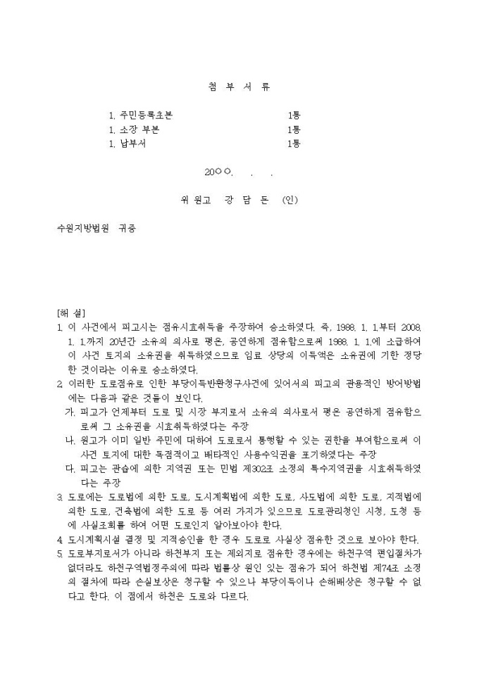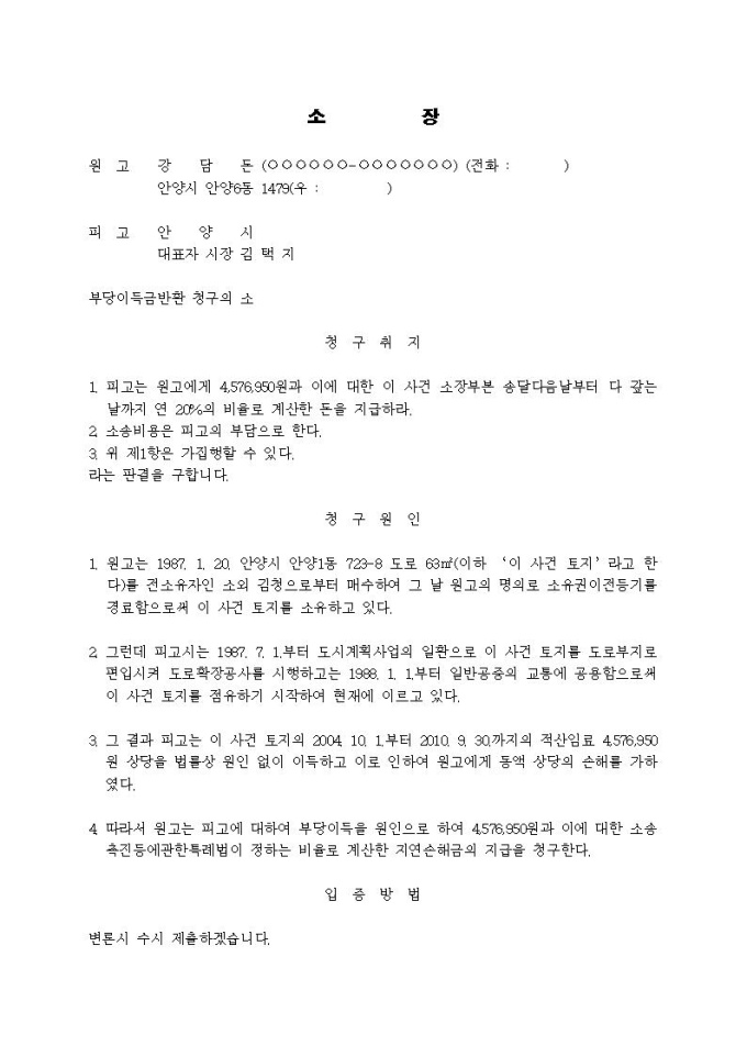 부당이득금반환청구 소장(도로를 불법점유)입니다.