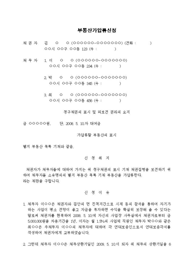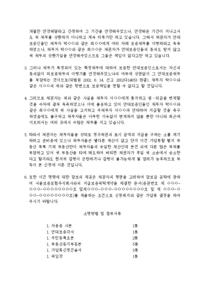 부동산가압류신청서(대여금, 기한연장의 경우, 연대보증책임)
