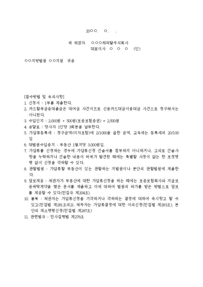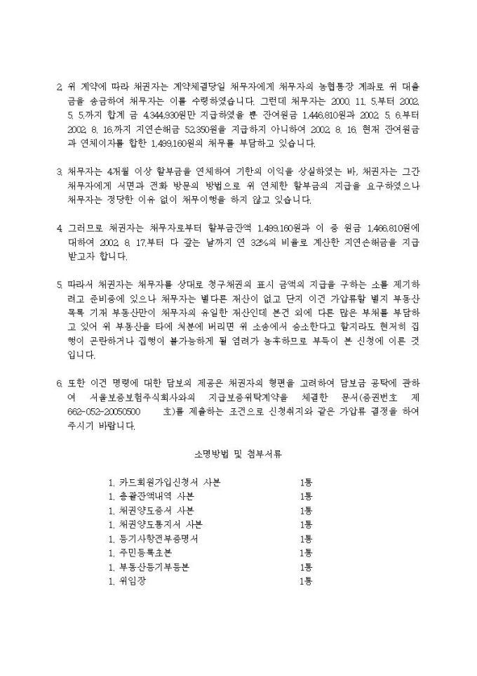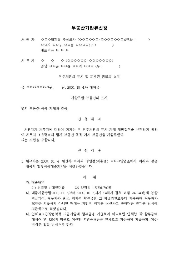 부동산가압류신청서(할부대출(대여금))입니다.
