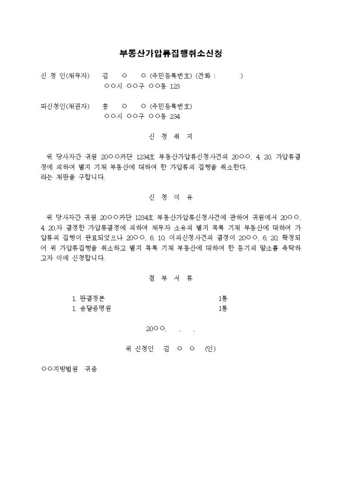 부동산가압류집행취소신청서(이의신청을 이유로)