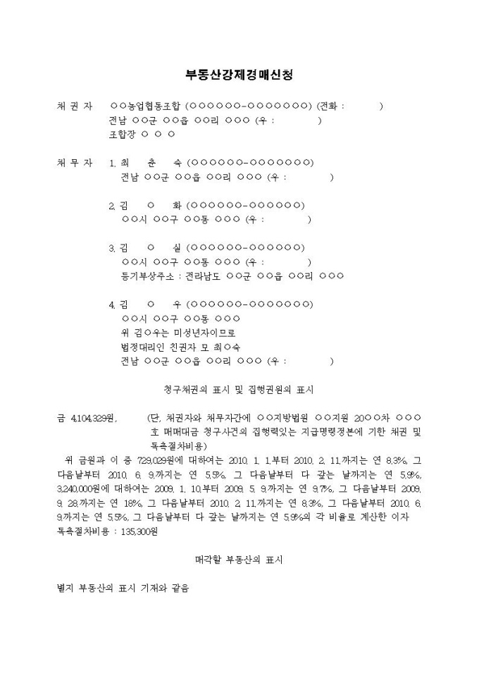 9,000원/월부동산강제경매신청서(미성년자포함)입니다.