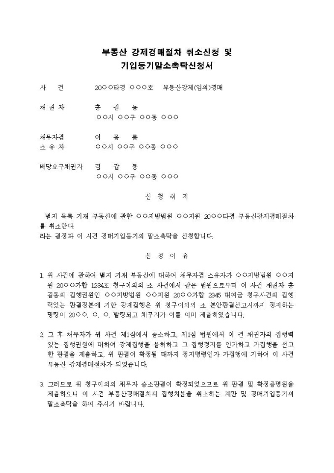 9,000원/월부동산강제경매절차 취소신청 및 기입등기말소촉탁신청서입니다.