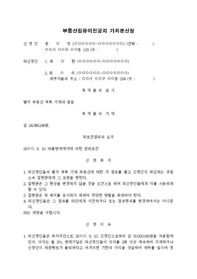 9,000원/월부동산점유이전금지 가처분신청서(대물변제예약에 의한 권리보전, 채무자보관형)입니다.