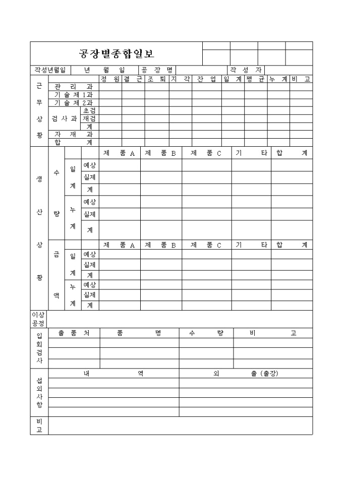 9,000원/월일일 근무상황,생산상황의 세부항목과 입회검사,섭외사항등으로 구성된 공장별 종합일보 양식입니다.