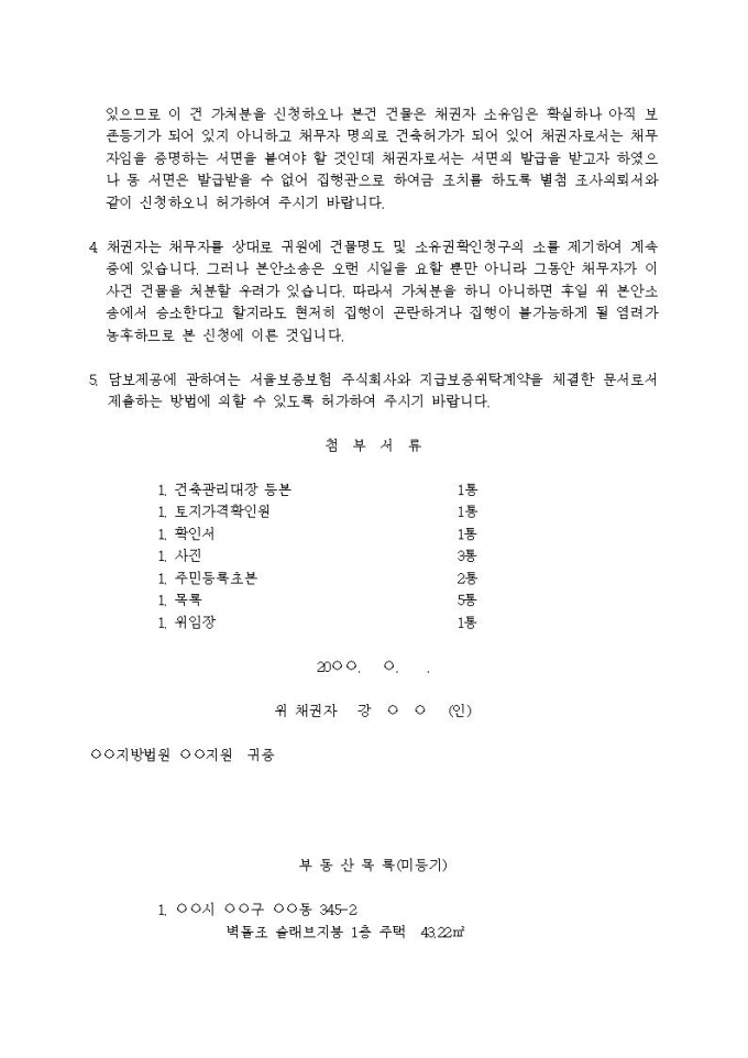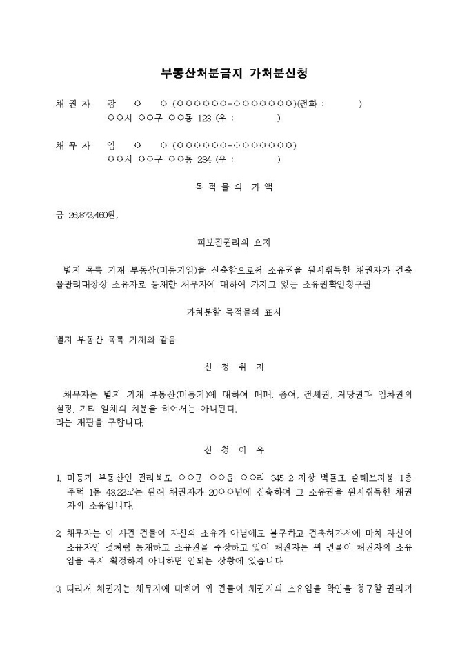 부동산처분금지 가처분신청서(미등기부동산 소유권확인)입니다.