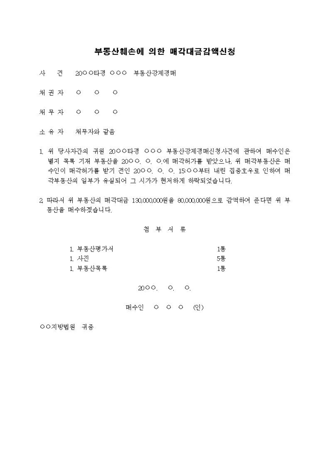 9,000원/월부동산훼손에 의한 매각대금감액신청서입니다.