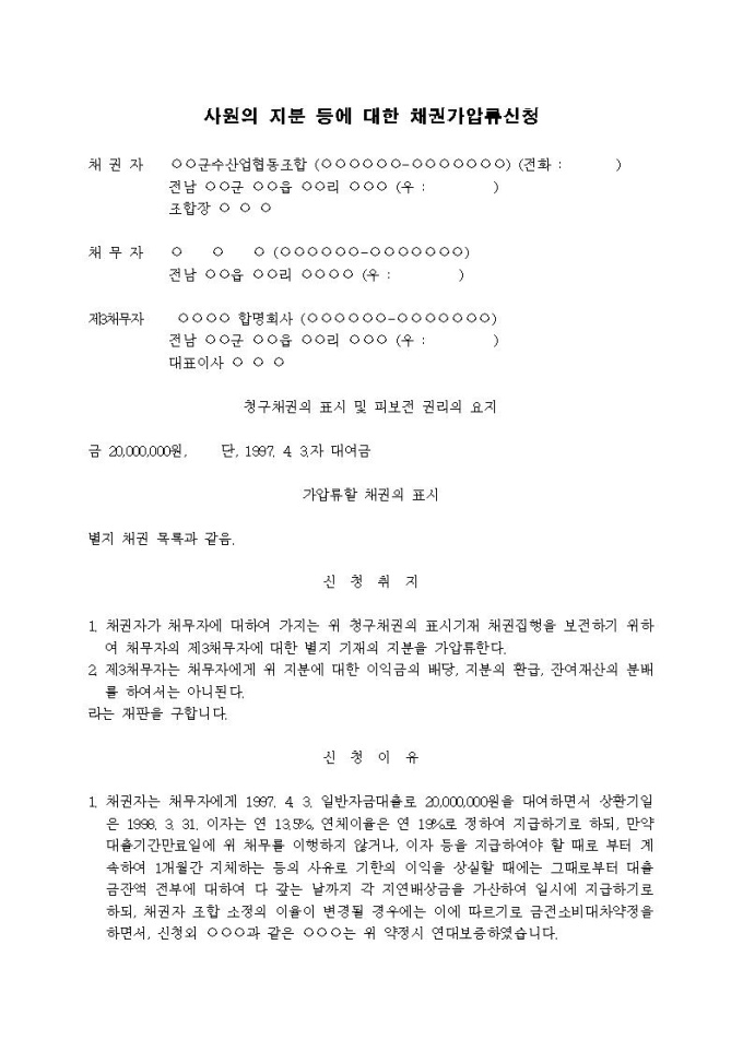 사원의 지분 등에 대한 채권가압류신청서입니다.