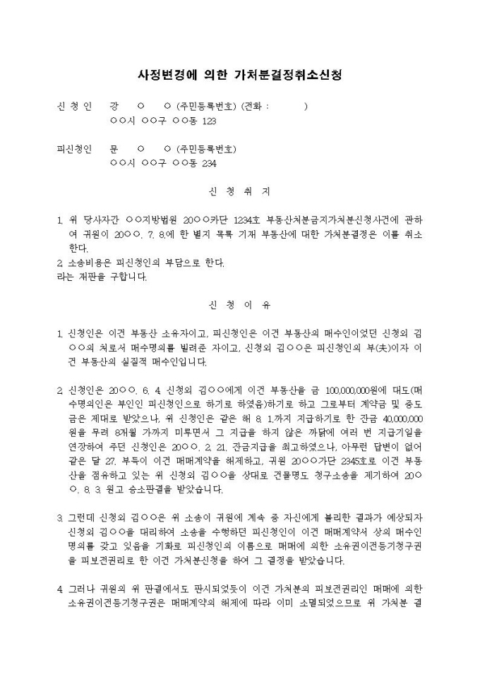 사정변경에 의한 가처분결정취소신청서(피보전권리의 소멸)