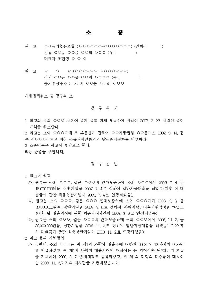 9,000원/월사해행위취소청구 소장(소유권이전등기말소)입니다.