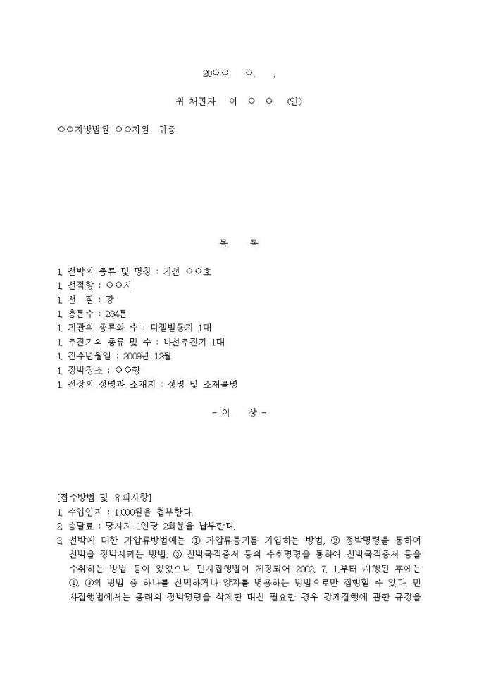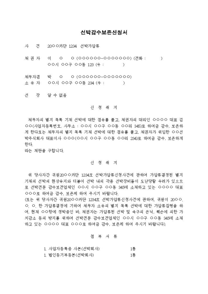 선박감수보전신청서(가압류 후)입니다.