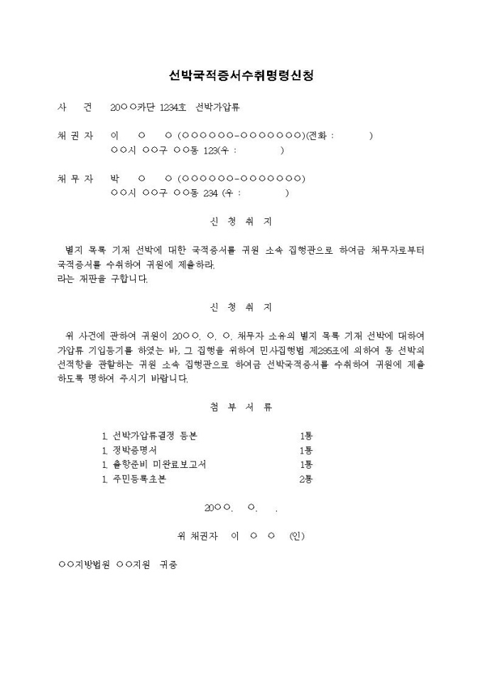 선박국적증서수취명령신청서(가압류집행을 위한)
