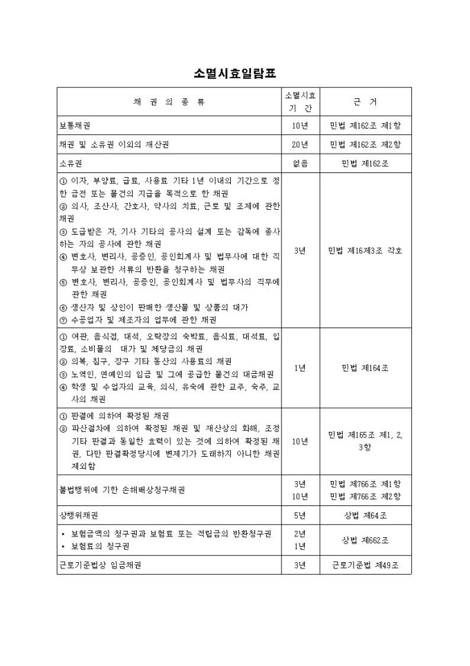 소멸시효일람표입니다.