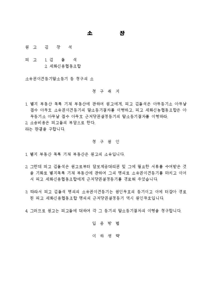 소유권이전등기등말소등기등 청구 소장(담보권설정대리인이 자신 명의로 소유권이전하고 담보설정한 사건)