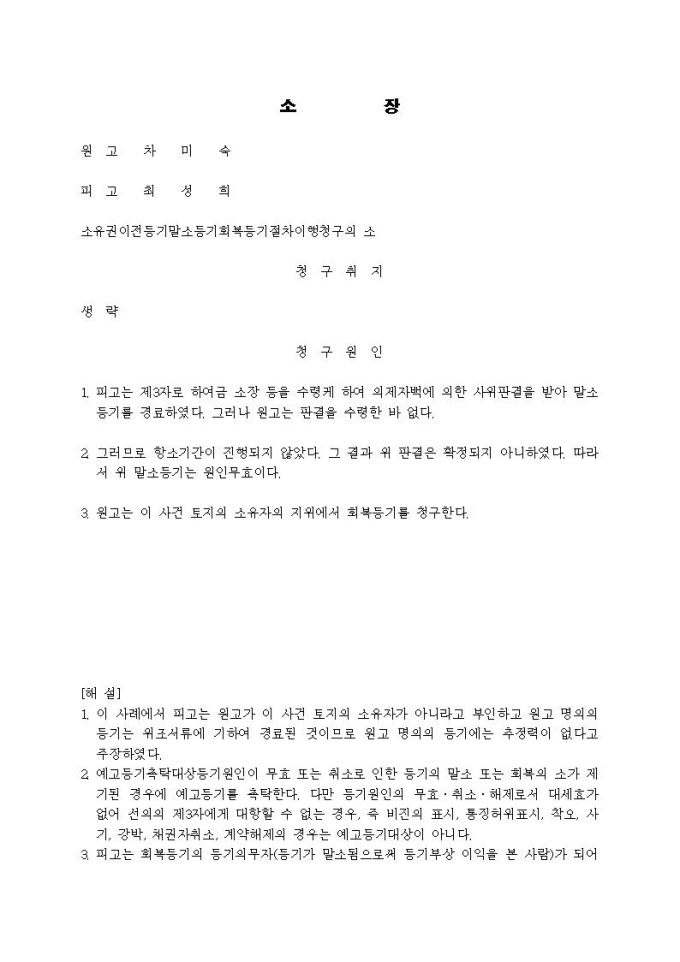 소유권이전등기말소등기회복등기절차이행청구 소장(말소등기회복등기청구사건)