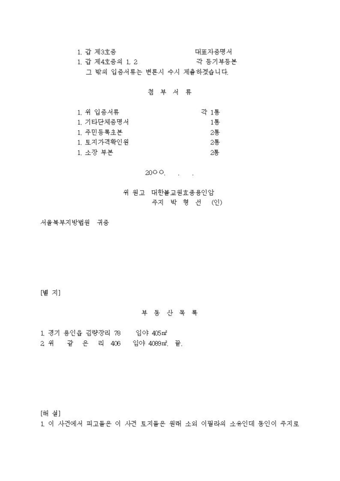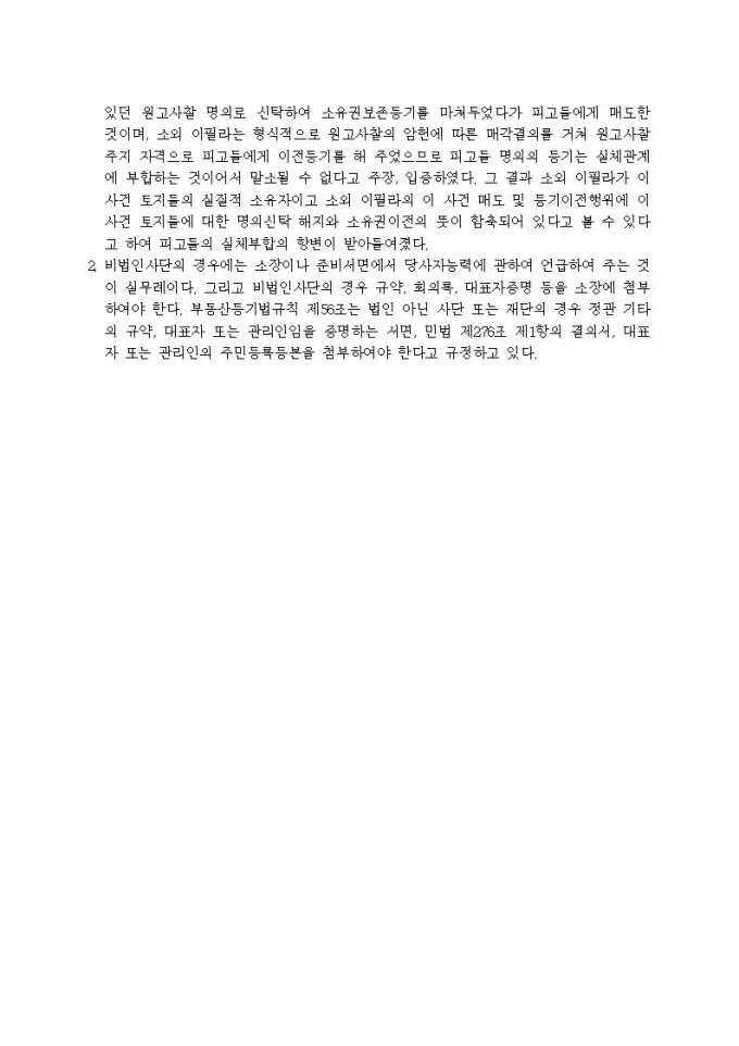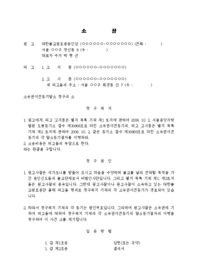 소유권이전등기말소청구 소장(사찰, 비법인사단, 총유관계, 소유권에 기한 물권적 청구, 실체관계 부합등기)입니다.
