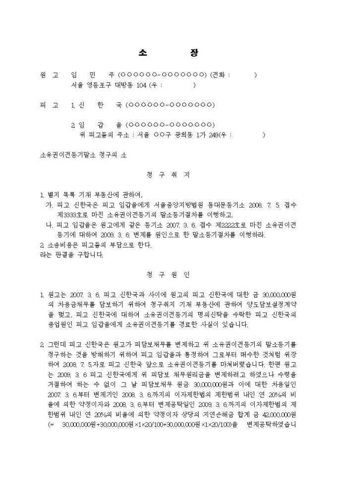 소유권이전등기말소청구 소장(소유권에 기한 물권적 청구, 담보계약과 명의신탁계약의 혼합된 계약)입니다.