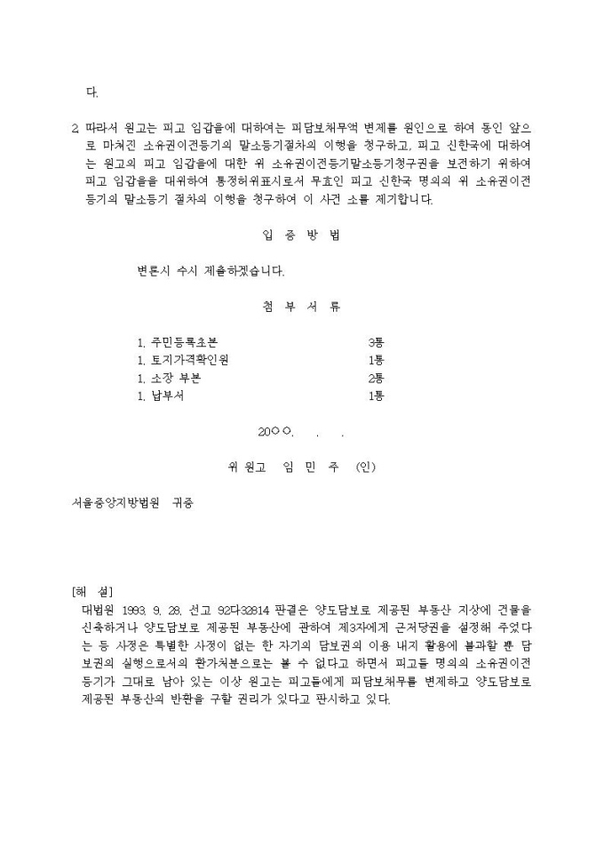 소유권이전등기말소청구 소장(소유권에 기한 물권적 청구, 담보계약과 명의신탁계약의 혼합된 계약)