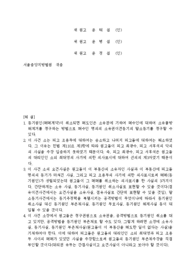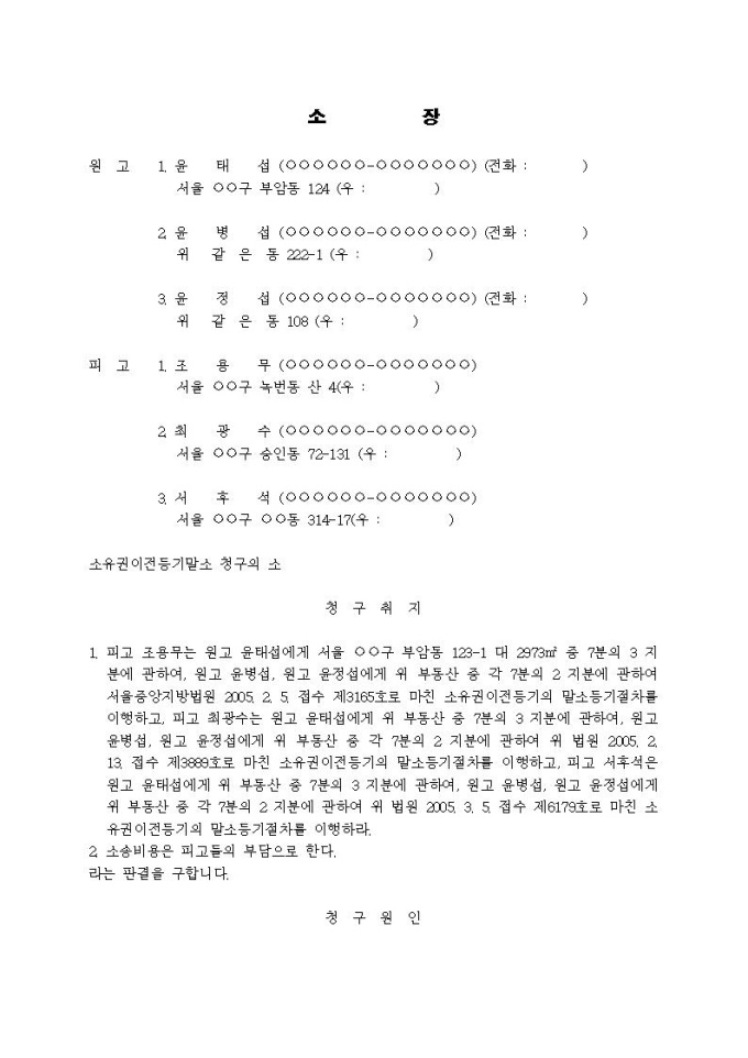 소유권이전등기말소청구 소장(소유권에 기한 물권적 청구, 사기로 인한 취소, 선의의 제3자, 표현대리, 이론상의 합일확정소송)입니다.