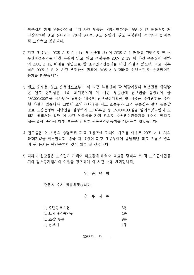 소유권이전등기말소청구 소장(소유권에 기한 물권적 청구, 사기로 인한 취소, 선의의 제3자, 표현대리, 이론상의 합일확정소송)