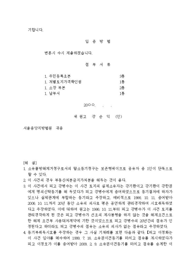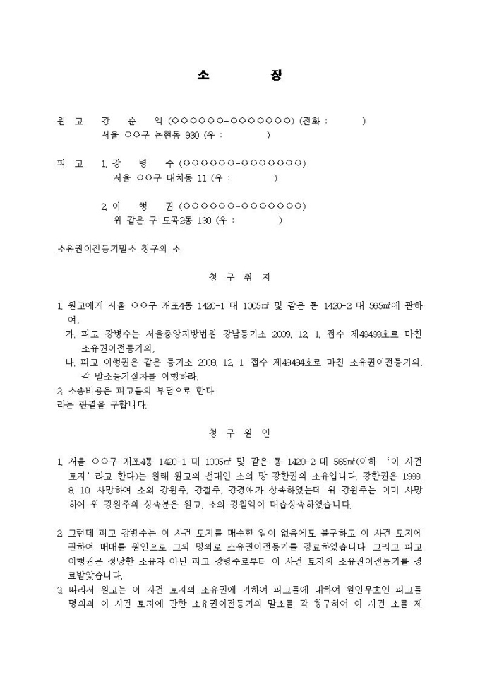 9,000원/월소유권이전등기말소청구 소장(소유권에 기한 물권적 청구, 상속, 대습상속, 실체관계 부합등기, 시효취득, 해제조건부 사용대차계약, 등기부취득시효)입니다.