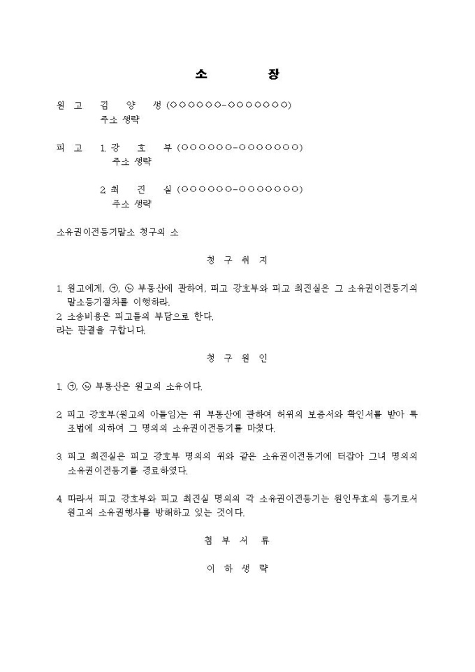 소유권이전등기말소청구 소장(특조법등기, 말소등기청구, 추인 사건)입니다.