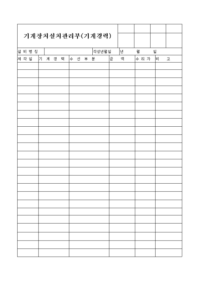 기계경력,수선부분,금액,수리자등으로 구분된 기계장치 설치관리부,기계경력 양식입니다.