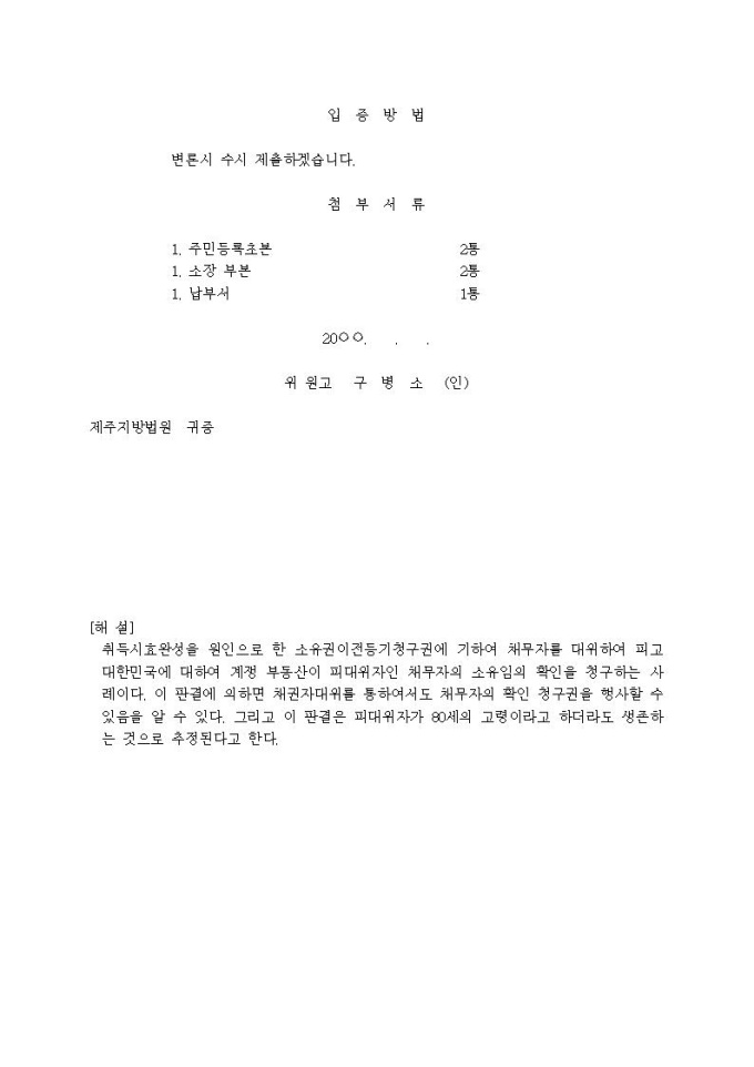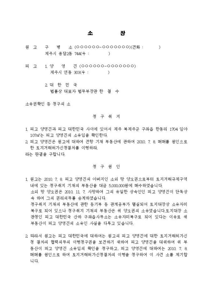 9,000원/월소유권확인등청구 소장(소유자 미복구 토지, 토지거래허가 신청절차협력청구, 채권자대위)입니다.