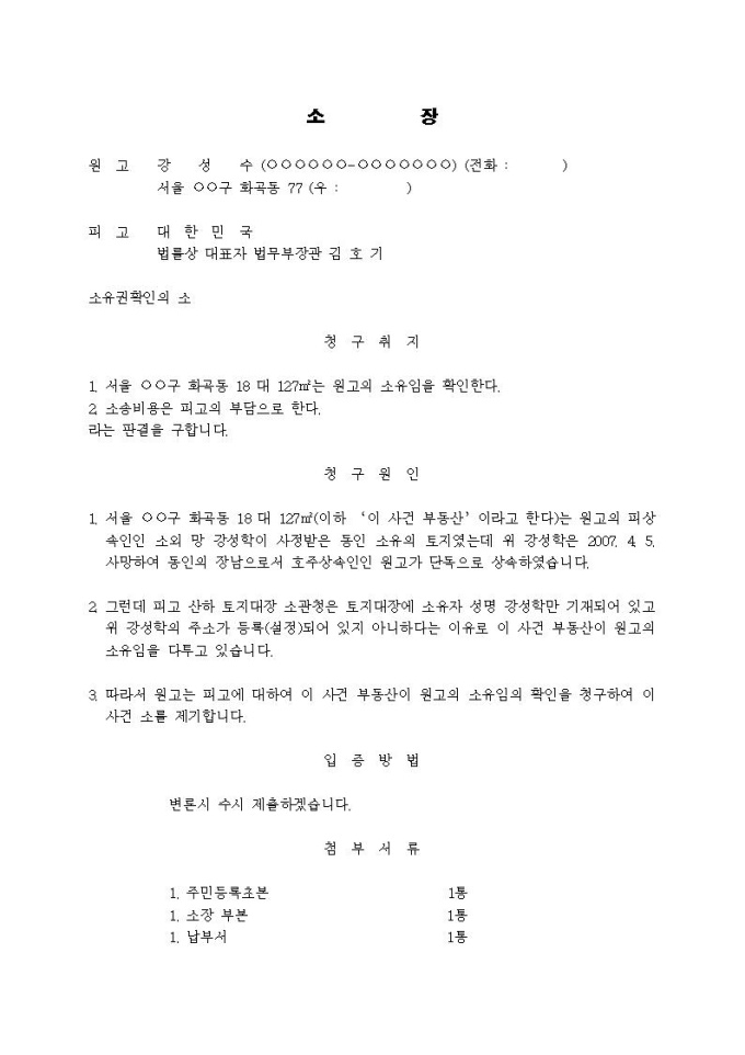 소유권확인청구 소장(사정, 상속, 주소 미설정 토지)