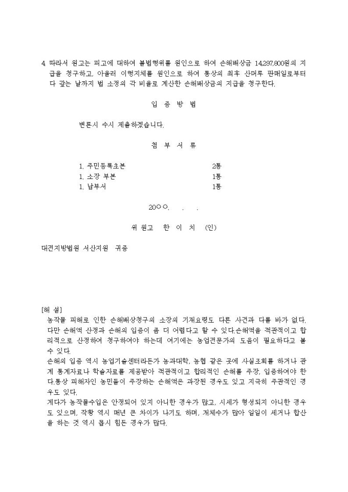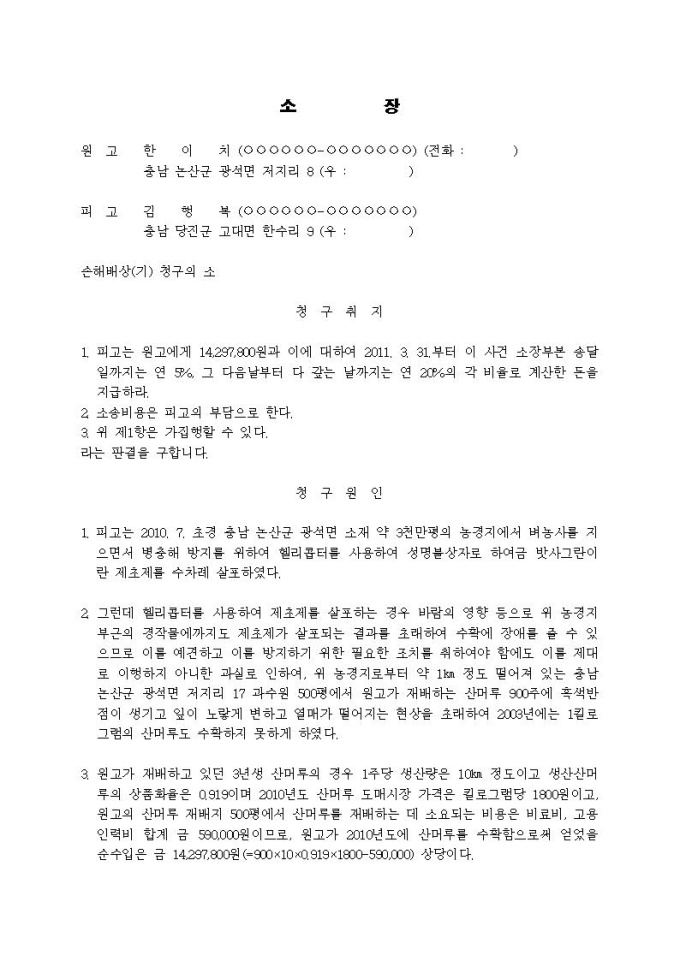 손해배상청구 소장(농작물피해)