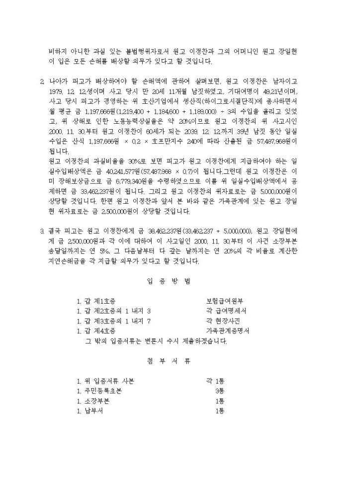 손해배상청구 소장(산업재해사고, 공작물책임 또는 일반불법행위책임)