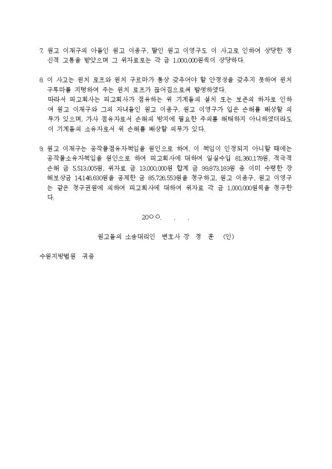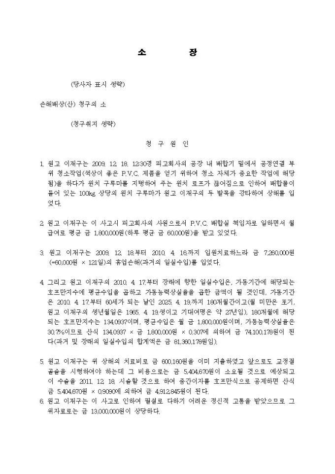9,000원/월손해배상청구 소장(산업재해사고, 공작물책임)입니다.